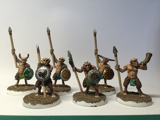 Loincloths: various greens and turquoise colours. I’ll probably paint the next batch in different colours for unit identification without having to resort to banners and flags.